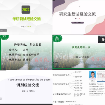 為了助力2022屆畢業(yè)生研究生復(fù)試,做好學(xué)生服務(wù)工作,3月2日,藥學(xué)院通過騰訊會(huì)議平臺(tái)開展線上考研復(fù)試經(jīng)驗(yàn)交流會(huì)。本次交流會(huì)邀請了6名我院優(yōu)秀校友,分別是就讀于四川大學(xué)的畢群杰、中國藥科大學(xué)的姚燕、沈陽藥科大學(xué)的閆翱翔、西南交通大學(xué)的竇重陽、大連醫(yī)科大學(xué)的王帥及湖北中醫(yī)藥大學(xué)的賀紫涵,他們圍繞復(fù)試技巧、調(diào)劑準(zhǔn)備及注意事項(xiàng)等主題深入交流分享了個(gè)人奮斗經(jīng)歷。藥學(xué)院黨總支書記王黎、校企合作辦主任閆平、學(xué)生科科長楊欣雨、2022屆畢業(yè)班輔導(dǎo)員及170余名考研上線與備考學(xué)生參加了本次會(huì)議。會(huì)議由校企合作辦李潔老師主持。