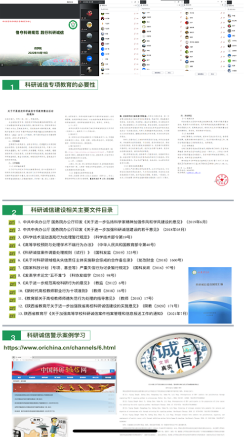為了更進(jìn)一步加強(qiáng)科研人員誠信意識,規(guī)范科研行為,持續(xù)改進(jìn)科研作風(fēng),營造誠實(shí)守信的科研環(huán)境,藥學(xué)院于2022年10月19日中午14:00召開了主題為“恪守科研規(guī)范 踐行科研誠信”的線上專題會議,藥學(xué)院全體黨政班子及全體教師參加了會議。