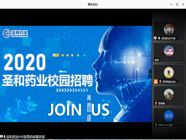 6月9日、6月11日,藥學院聯(lián)合南京圣和藥業(yè)股份有限公司、北京民海生物科技有限公司舉行專場招聘會及優(yōu)秀校友進行就業(yè)經驗分享。藥學院黨總支副書記王黎、校企辦主任閆平、南京圣和藥業(yè)股份有限公司HR袁昊、北京民海生物科技有限公司地區(qū)經理李娟、優(yōu)秀校友方云出席,校企合作辦工作人員、2020屆畢業(yè)班輔導員及畢業(yè)生參加。