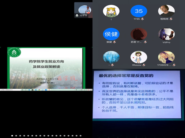 受新冠肺炎疫情影響,2020屆畢業(yè)生就業(yè)工作面臨更多挑戰(zhàn),為了使同學(xué)們充分了解當(dāng)前就業(yè)創(chuàng)業(yè)政策、把握機(jī)遇,4月29日上午,藥學(xué)院舉辦“云端”就業(yè)創(chuàng)業(yè)指導(dǎo)交流會(huì)。藥學(xué)院黨總支副書記王黎、校企合作辦全體老師、畢業(yè)班輔導(dǎo)員和藥學(xué)院高年級(jí)學(xué)生參加了本次會(huì)議,會(huì)議由學(xué)生科科長(zhǎng)楊欣雨主持。