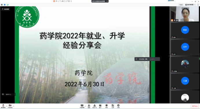 2022年6月30日,為激勵廣大學(xué)生樹立志向、追逐夢想,藥學(xué)院邀請十位優(yōu)秀校友舉辦了就業(yè)、升學(xué)經(jīng)驗(yàn)線上分享會,黨總支書記王黎、校企合作辦主任閆平、相關(guān)輔導(dǎo)員及2023屆學(xué)生參加會議。分享會由校企合作辦李潔老師主持。