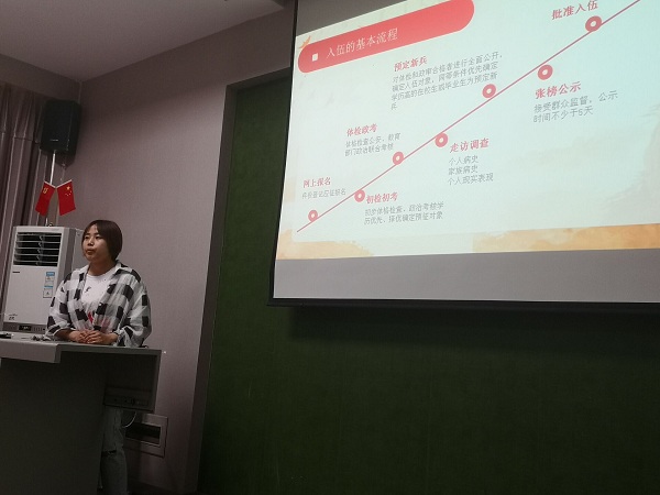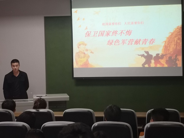 其次,藥學(xué)院藥學(xué)1734班退伍學(xué)生閆翱翔帶領(lǐng)大家進(jìn)行“2019年征兵宣傳工作”相關(guān)文件的學(xué)習(xí)。閆翱翔主要從征兵對(duì)象,入伍流程、入伍優(yōu)待政策以及入伍學(xué)籍保留等學(xué)生關(guān)心的方面進(jìn)行詳細(xì)的講解,讓學(xué)生了解征兵入伍的基本條件,比如在體檢方面,針對(duì)年齡、視力、身高和體重都有嚴(yán)格的要求。另外,國家為了加強(qiáng)大學(xué)生征兵入伍宣傳力度,也是針對(duì)在校生以及應(yīng)屆畢業(yè)生提供了“四個(gè)優(yōu)先”政策,比如優(yōu)先報(bào)名,優(yōu)先體檢政考,優(yōu)先審批以及優(yōu)先安排分配,鼓勵(lì)大學(xué)生積極入伍參軍,報(bào)效組織,實(shí)現(xiàn)人生價(jià)值。同時(shí),閆翱翔也讓與會(huì)了解到入伍相關(guān)優(yōu)惠政策主要包括學(xué)費(fèi)補(bǔ)貼,家屬優(yōu)待金,生活補(bǔ)助以及地方經(jīng)濟(jì)補(bǔ)助金等。最后,閆翱翔同學(xué)針對(duì)學(xué)生關(guān)心的學(xué)籍問題也做了詳細(xì)說明,凡是入伍參軍的在校大學(xué)生都可以提出保留學(xué)籍申請(qǐng),保留2年,退伍后可以辦理復(fù)學(xué)手續(xù)重新進(jìn)入大學(xué)就讀,解決了學(xué)生的后顧之憂。此外,針對(duì)退伍后自愿復(fù)學(xué)的大學(xué)生,國家也會(huì)實(shí)行一次性補(bǔ)償或獲得的國家助學(xué)貸款實(shí)行代償,總之,國家針對(duì)征兵入伍的大學(xué)生制定了各種優(yōu)惠政策,積極鼓勵(lì)大家參軍入伍。
