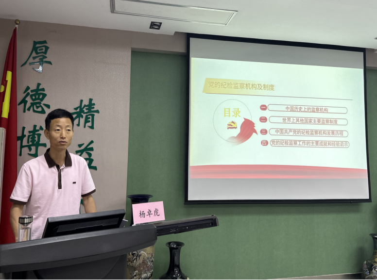 隨后,楊卓虎以“黨的紀(jì)檢監(jiān)察機(jī)構(gòu)及制度”為題講授黨紀(jì)學(xué)習(xí)教育專題黨課。黨課運用大量的史實、理論成果回顧了中國共產(chǎn)黨紀(jì)檢監(jiān)察機(jī)構(gòu)的發(fā)展歷程、黨的紀(jì)檢監(jiān)察工作的主要成就和經(jīng)驗啟示。他勉勵全體師生黨員要自覺將黨規(guī)黨紀(jì)作為一門必修課,提高思想認(rèn)識,不斷提升自身素質(zhì),加強(qiáng)黨性錘煉,主動擔(dān)當(dāng)作為,賦能學(xué)校高質(zhì)量發(fā)展。