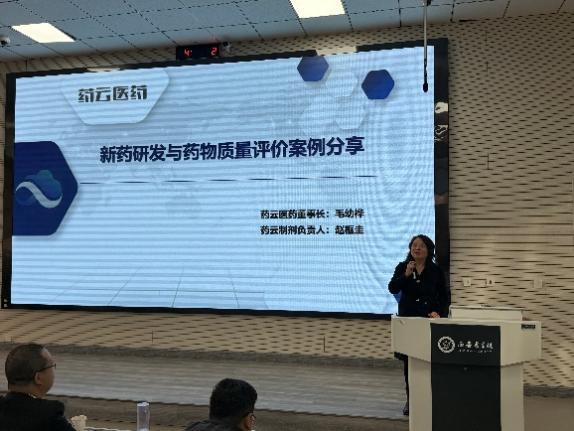 隨后,毛幼樺結(jié)合自己從事藥學(xué)領(lǐng)域三十六年的工作經(jīng)歷,介紹了藥云醫(yī)藥公司的創(chuàng)業(yè)研發(fā)歷程,對藥學(xué)生的職業(yè)發(fā)展提出了寶貴建議。藥云醫(yī)藥質(zhì)量技術(shù)總監(jiān)趙框圭以兩個新藥開發(fā)的案例生動的為學(xué)生講解了新藥研發(fā)的過程及質(zhì)量評價在醫(yī)藥開發(fā)中的重要作用。