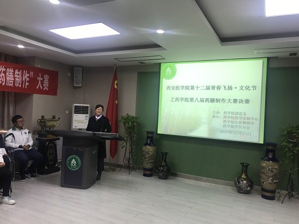2017年12月13日,西安醫(yī)學(xué)院第十二屆青春飛揚(yáng)文化節(jié)之藥學(xué)院第八屆藥膳制作大賽決賽在藥學(xué)院三樓會(huì)議室拉開(kāi)帷幕。西安醫(yī)學(xué)院黨委副書(shū)記熊冬梅出席并講話。參加本次大賽的嘉賓有藥學(xué)院黨總支副書(shū)記呂忠田、西安醫(yī)學(xué)院學(xué)工部副部長(zhǎng)、團(tuán)委書(shū)記王燕、西安醫(yī)學(xué)院團(tuán)委副書(shū)記李美玥,擔(dān)任本次大賽的評(píng)委有藥學(xué)院實(shí)驗(yàn)中心主任魏彩霞老師、生藥教研室主任張寒老師、中藥藥理教研室主任孫艷平老師以及生藥教研室張彥老師、申旭霽老師、汪興軍老師。