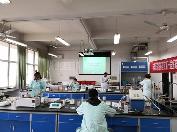 本次操作技能比賽是經(jīng)過前期筆試選拔出的前20名同學(xué)進行現(xiàn)場實驗操作,比賽內(nèi)容通過當(dāng)天現(xiàn)場抽簽決定,從實驗準備、實驗操作到完成實驗報告總時間設(shè)定為5個小時。操作技能成績由實驗操作過程(70%)和實驗報告(30%)兩部分組成。賽前藥學(xué)院分析測試中心張劍博士和張博主任分別進行了比賽情況說明和比賽規(guī)定宣講,化學(xué)實驗中心范濤主任進行了安全教育。比賽持續(xù)五個小時左右,學(xué)生操作過程是一絲不茍,認真細致,無怨無悔,整個比賽過程安全無事故。當(dāng)天下午對操作成績和實驗報告成績進行匯總、加權(quán)得到綜合排名。