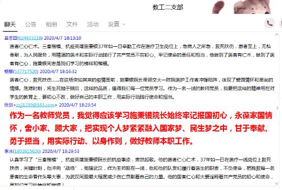 2020年伊始,突如其來的新型冠狀病毒肺炎疫情給我們的工作、學(xué)習(xí)和生活帶來了巨大的影響。2020年3月,藥學(xué)院黨總支教工二支部借助網(wǎng)絡(luò)QQ平臺開展學(xué)習(xí)‘三秦楷模’沖向“戰(zhàn)場”的勇士——西安交大一附院院長施秉銀抗疫事跡主題黨會。各位黨員認(rèn)真集中學(xué)習(xí),會后積極討論,結(jié)合工作談感想并分享開學(xué)后線上辦公、遠(yuǎn)程教研活動等“停課不停學(xué)”的工作體會。 國家抗擊疫情的關(guān)鍵時刻,每一位黨員教師,用堅定的語言,有力的行動詮釋“不忘初心,牢記使命”。高蘇亞老師說:“我有信心帶著這支精兵強將,打贏這場沒有硝煙的戰(zhàn)爭。”施秉銀院長義無反顧、向漢而行,這是危難時刻的家國情懷,這是特殊時期的百姓最需要的匠心大醫(yī),是我們學(xué)習(xí)的楷模!何昊老師說:施秉銀院長的行動詮釋了醫(yī)學(xué)名言“有時,去治愈;常常,去幫助;總是,去安慰。”在疫情當(dāng)前的危難時刻,每個人都堅守崗位,盡職盡責(zé),就能早日獲取抗疫的全面勝利。高迎春老師說:三秦楷模施秉銀,身為頂尖三甲醫(yī)院的院長,馳援武漢、抗擊非典、汶川地震救援……每一次他都是沖向‘戰(zhàn)場’的勇士!作為一名普通教師,深受感動,要更應(yīng)該珍惜來之不易的穩(wěn)定局面,立足本職工作,認(rèn)真做好在線教學(xué),比課堂教學(xué)更用心,盡職盡責(zé)完成停課不停學(xué)的任務(wù)!
