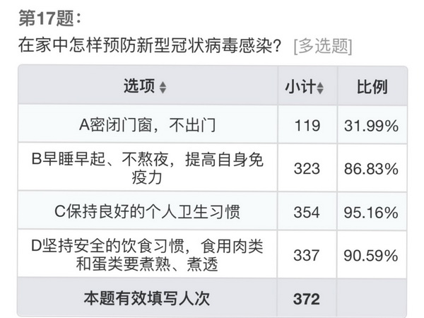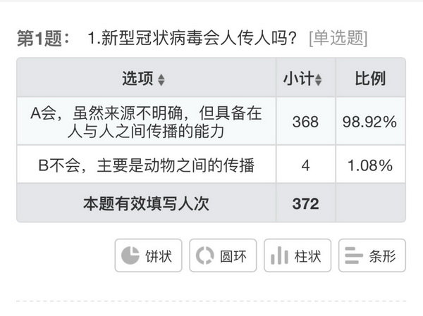 2020年的春節(jié),對(duì)全國(guó)人民來(lái)說(shuō)是一個(gè)不同的新年。沒有煙花,沒有聚會(huì),一種傳染性高的新型冠狀病毒隨著新年的到來(lái)悄然走近我們。一月二十三日凌晨,武漢宣布全市城市公交、地鐵、輪渡、長(zhǎng)途客運(yùn)暫停運(yùn)營(yíng),機(jī)場(chǎng)、火車站等離漢通道關(guān)閉;這一切都在告訴全國(guó)人民這次病毒的來(lái)勢(shì)洶洶。面對(duì)疫情,西安醫(yī)學(xué)院藥學(xué)院團(tuán)總支響應(yīng)號(hào)召積極開展疫情防控工作,組織同學(xué)們?cè)诰€進(jìn)行關(guān)于新型冠狀病毒的知識(shí)問(wèn)答。 本次知識(shí)問(wèn)答從新冠病毒的轉(zhuǎn)播途徑、易感人群,病毒可能的來(lái)源、外省返回需要的隔離時(shí)間以及如何正確使用簡(jiǎn)單的醫(yī)療器具防控病毒等方面進(jìn)行問(wèn)題設(shè)定。通過(guò)做問(wèn)卷的方式,同學(xué)們能夠在最短的時(shí)間內(nèi)了解關(guān)于病毒的大概情況和有效的防護(hù)措施以及我國(guó)目前的疫情狀況,促進(jìn)學(xué)生帶動(dòng)家人重視并做好防控。本次問(wèn)卷調(diào)查結(jié)果顯示:96%以上的同學(xué)對(duì)于這次問(wèn)卷上的問(wèn)題的解答都游刃有余,可以看出同學(xué)們的防護(hù)意識(shí)較強(qiáng),對(duì)新型冠狀病毒有關(guān)知識(shí)及其正確的防護(hù)措施都有一定的認(rèn)識(shí)。