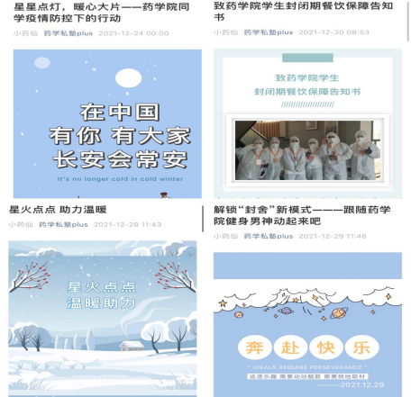 三、利用新媒體平臺主動發(fā)聲,傳遞正能量。借助藥學院微信公眾號“藥學私塾plus”、師生微信朋友圈及視頻號等平臺,圍繞抗擊疫情開展線上活動。截至目前,推送“星星點點,暖心大片 --藥學院同學疫情防控下的行動”“解鎖“封舍”新模式--跟隨藥學院健身男神動起來吧”“致藥學院學生封閉期餐飲保障告知書”等思政宣傳推文,展現(xiàn)西醫(yī)青年使命擔當,形成積極抗疫的良好氛圍。