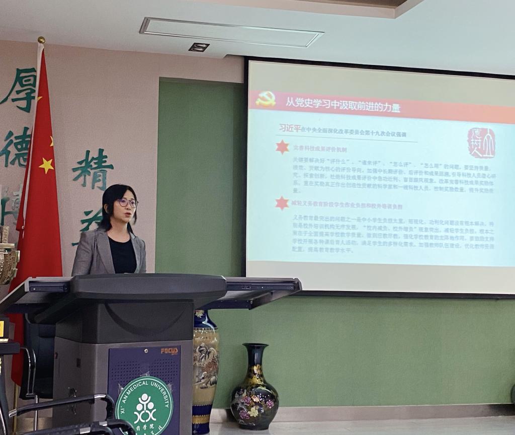 宣講活動(dòng)以秦蓓院長(zhǎng)的黨課《黨史學(xué)習(xí)與立德樹(shù)人要求同進(jìn)并舉》及支部書(shū)記楊黎彬的黨課《黨史學(xué)習(xí)的目的和意義》為主要內(nèi)容進(jìn)行。秦蓓院長(zhǎng)首先通過(guò)新中國(guó)成立以來(lái)我國(guó)教育工作之路的介紹,對(duì)黨史中涉及教育的重大事件及人物進(jìn)行了回顧,之后結(jié)合現(xiàn)在的大學(xué)教育工作對(duì)全體黨員提出了青年人才要自覺(jué)錘煉科學(xué)精神,以及從黨史學(xué)習(xí)中汲取前進(jìn)力量的工作要求。楊黎彬書(shū)記結(jié)合黨在一百年的發(fā)展壯大過(guò)程中遇到的困難、挑戰(zhàn)對(duì)黨史學(xué)習(xí)的重要目的及意義進(jìn)行了深入的講解。